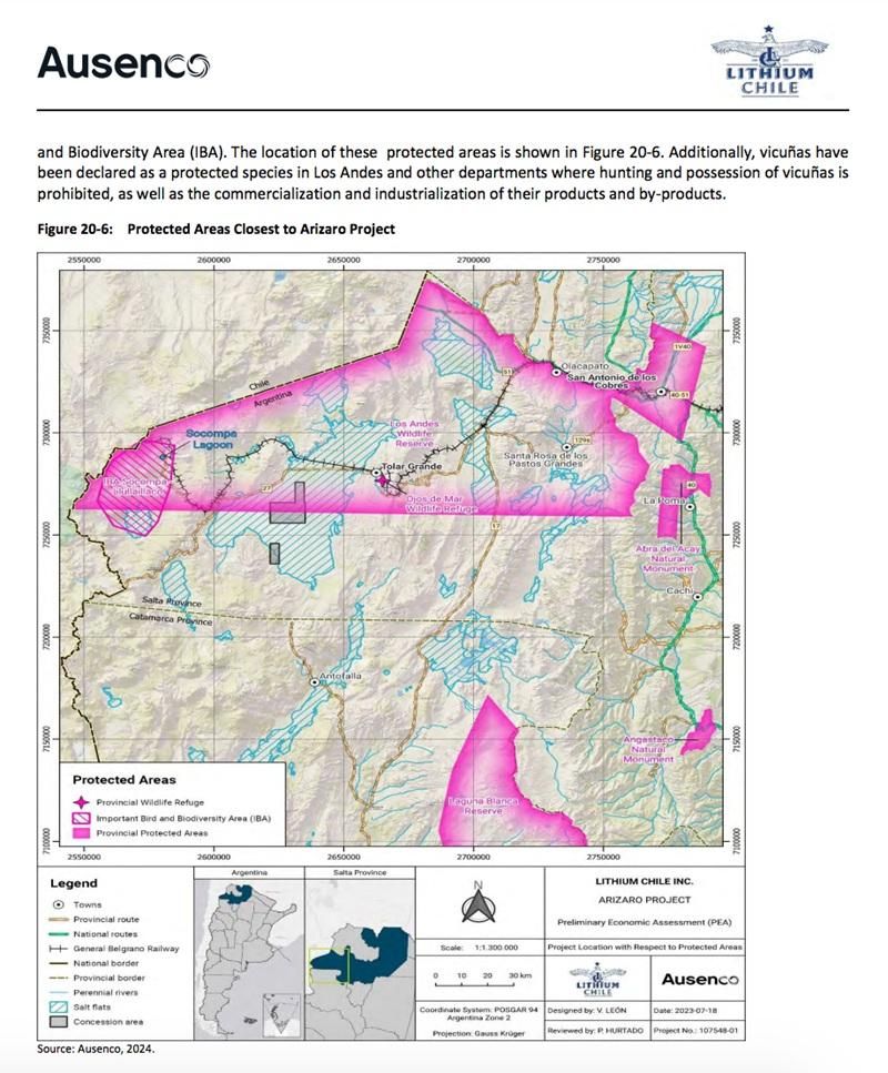 En el informe técnico de su proyecto en Arizaro fechado en julio de 2024, Lithium Chile menciona que hay varias áreas protegidas cerca, incluyendo la Reserva Los Andes, que “se superpone con la parte norte del área de concesión”. No menciona si su iniciativa minera tendría algún impacto en el área protegida ni el plan de manejo, aunque subraya que uno de los objetivos de la reserva es “estudiar y aplicar técnicas de desarrollo y uso racional de los recursos naturales para mantener el buen funcionamiento de los ecosistemas clave”, como salares y humedales altoandinos.