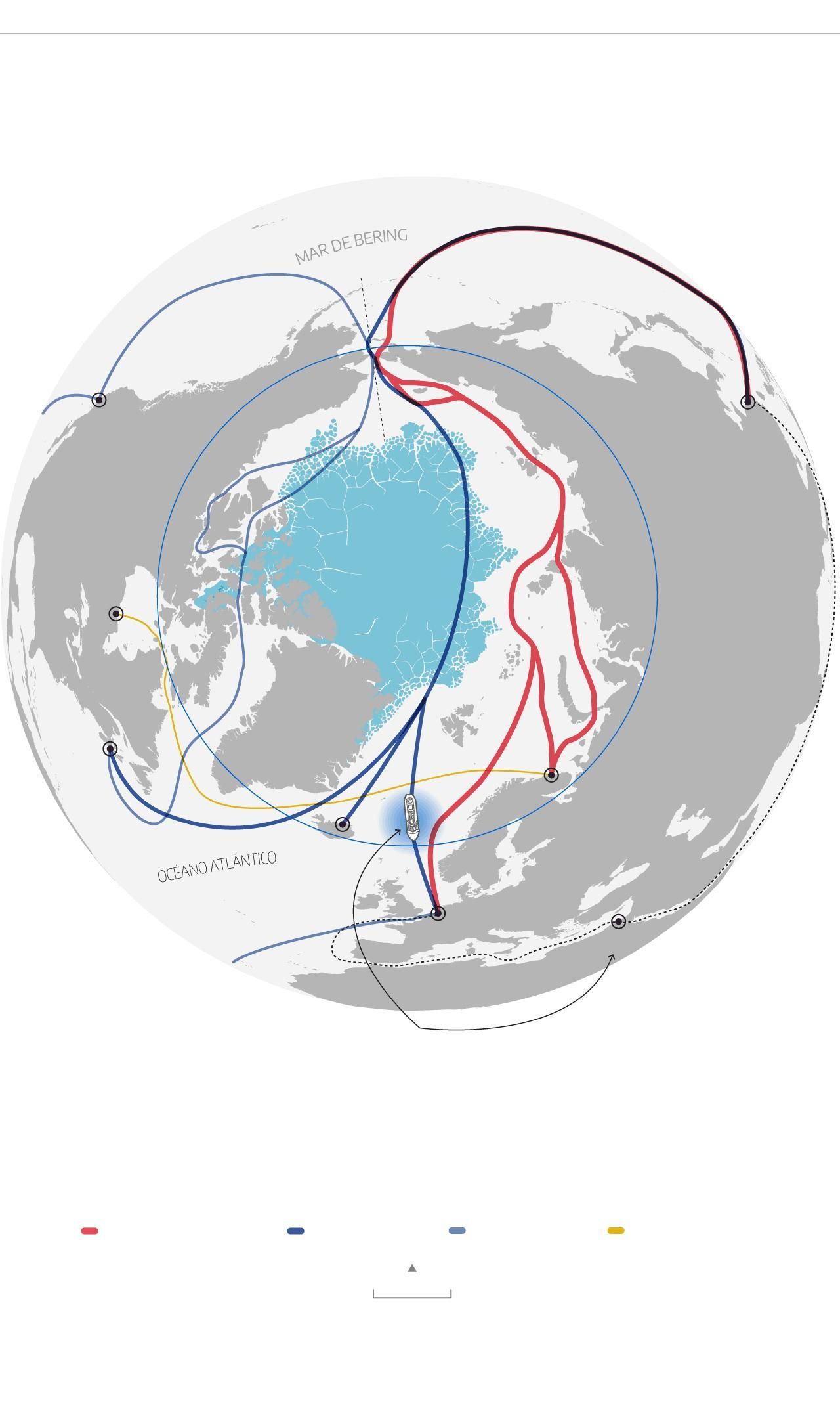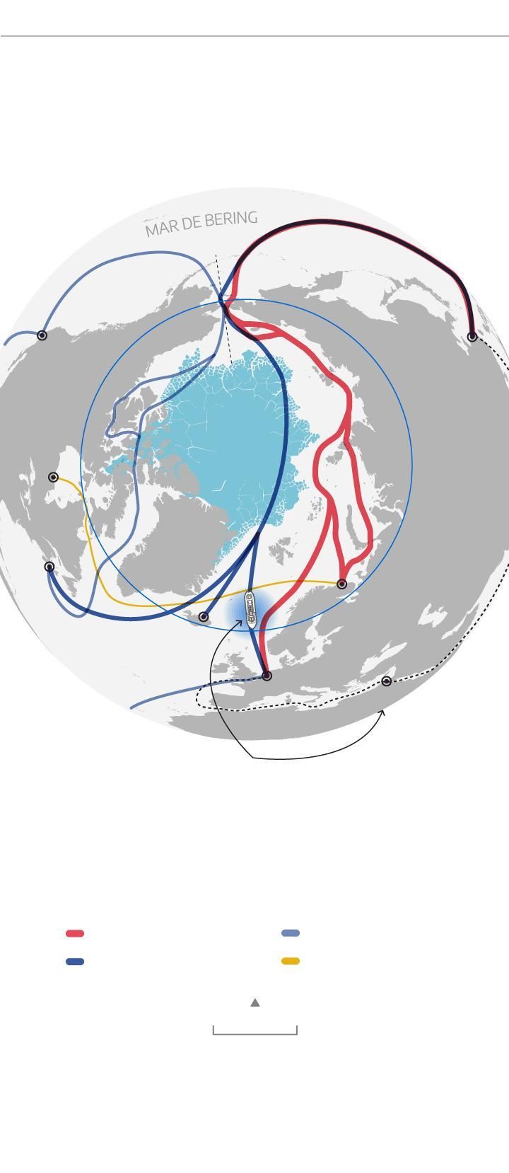 Si se toma la ruta norte ártica, actualmente, es Rusia quien regula ese paso para “prevenir la contaminación en el mar cubierto de hielo”, según le reconoce la Convención del Mar. Las caravanas marítimas suelen ser de tres rompehielos, un carguero, otros tres rompehielos, otro carguero...